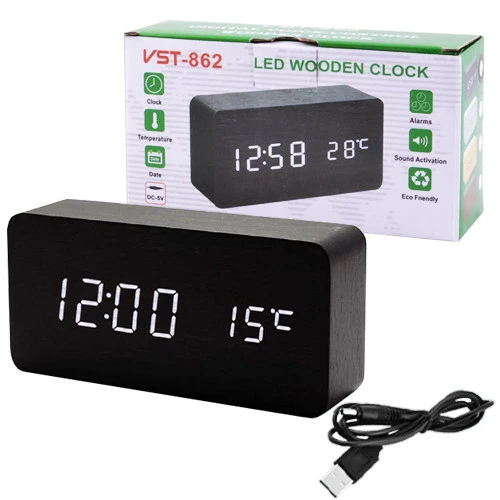 Часы сетевые VST-862-6 белые, (корпус черный) температура, USB
