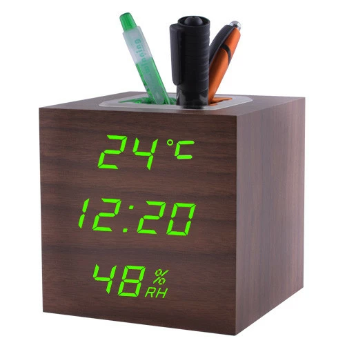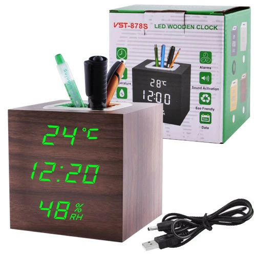 Часы сетевые VST-878S-4, зеленые, (корпус коричневый) температура, влажность, USB